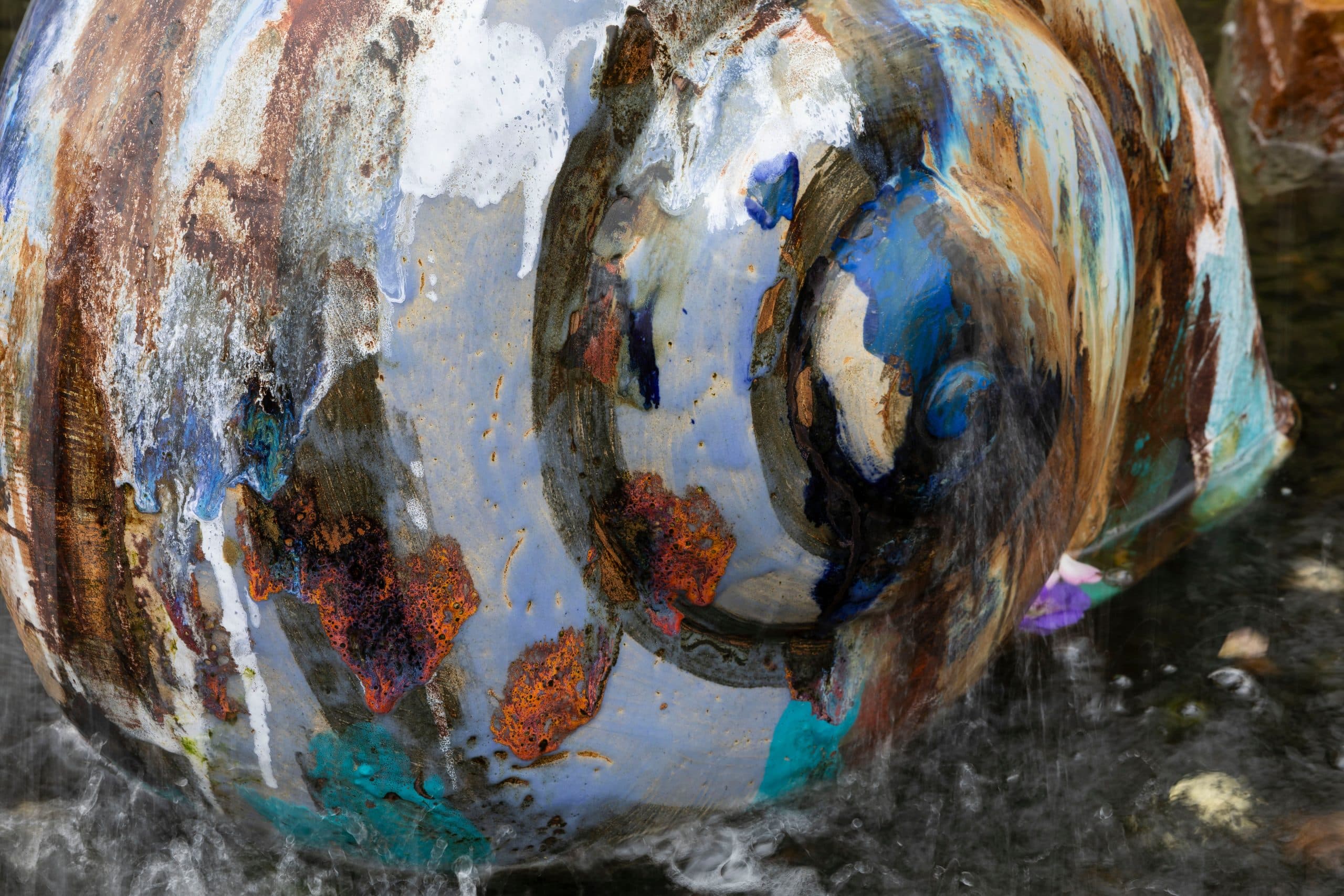 A Cosmic Reset is a fountain constructed from enormous spiralling shells. It references the snail as one of many organisms that comprise the diverse ecosystem of the Artland. The work uses the sonorous drip and gush of water as a material, alongside Aldridge’s stacked sculptural forms and painterly glazes.