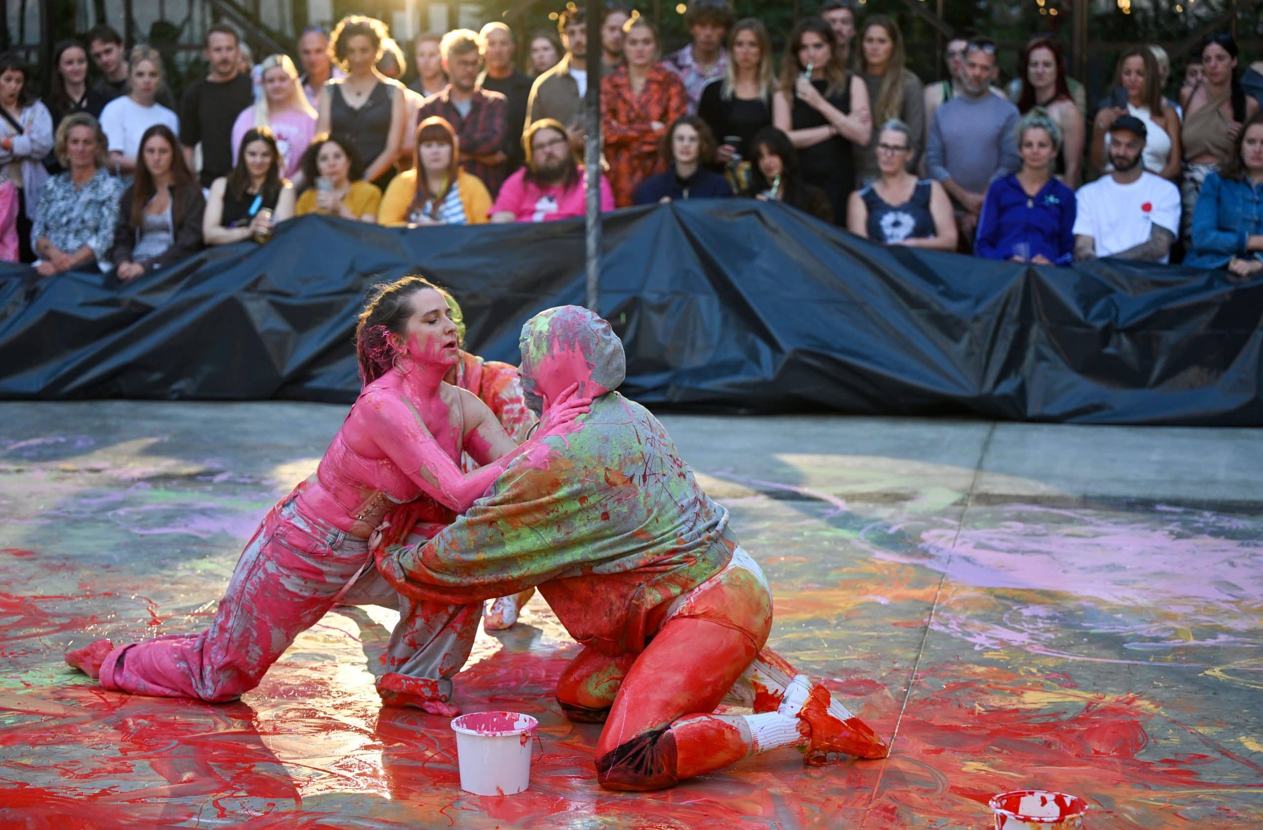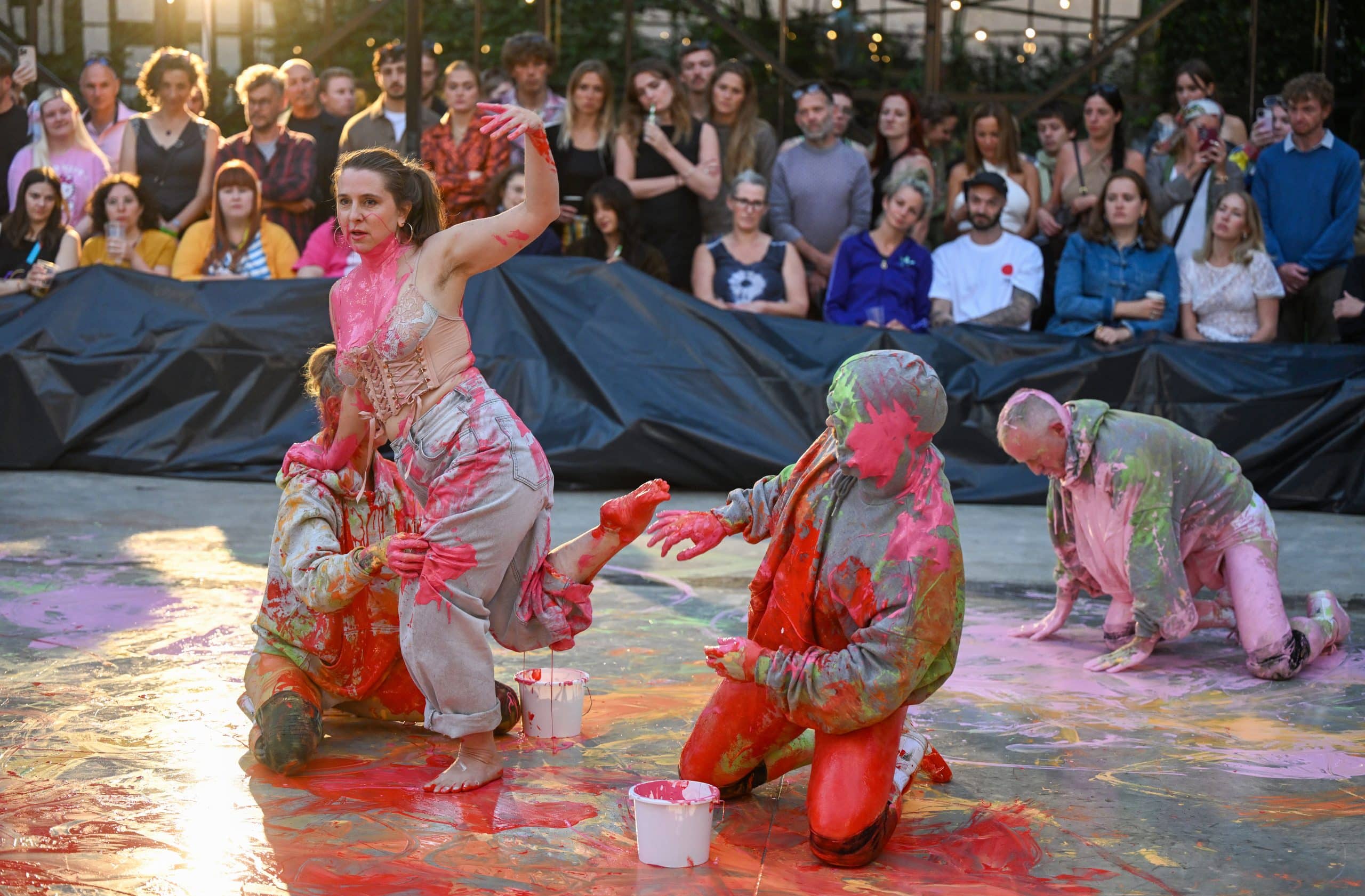 Peake’s work explores notions of materiality and physicality: the body as site and vehicle of protest; the erotic and sensual as tools for queering materiality; the subjective and imagined body as a force equal to those that move in our objective flesh-bound world. By encouraging chaotic relationships between the body and material, Peake creates radical and outlandish performances, which in turn generate temporary alliances and micro-communities within the audience. Peake’s painting is as an extension of the body itself: it is produced gesturally and performatively, and is both a manifestation of the external body in motion and the way personal experience and feeling is recorded within the tissue and bones. Her painting practice comes together with sculpture and performance in a reciprocal nature: engaging in a shared dialogue and creating multiple modes of processing performance, and the interrelations between dancers, audiences and sites.