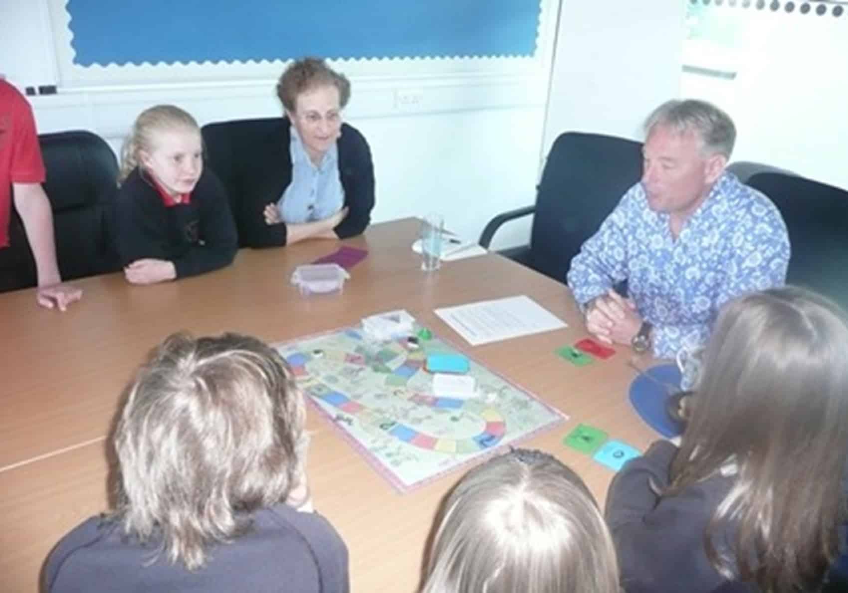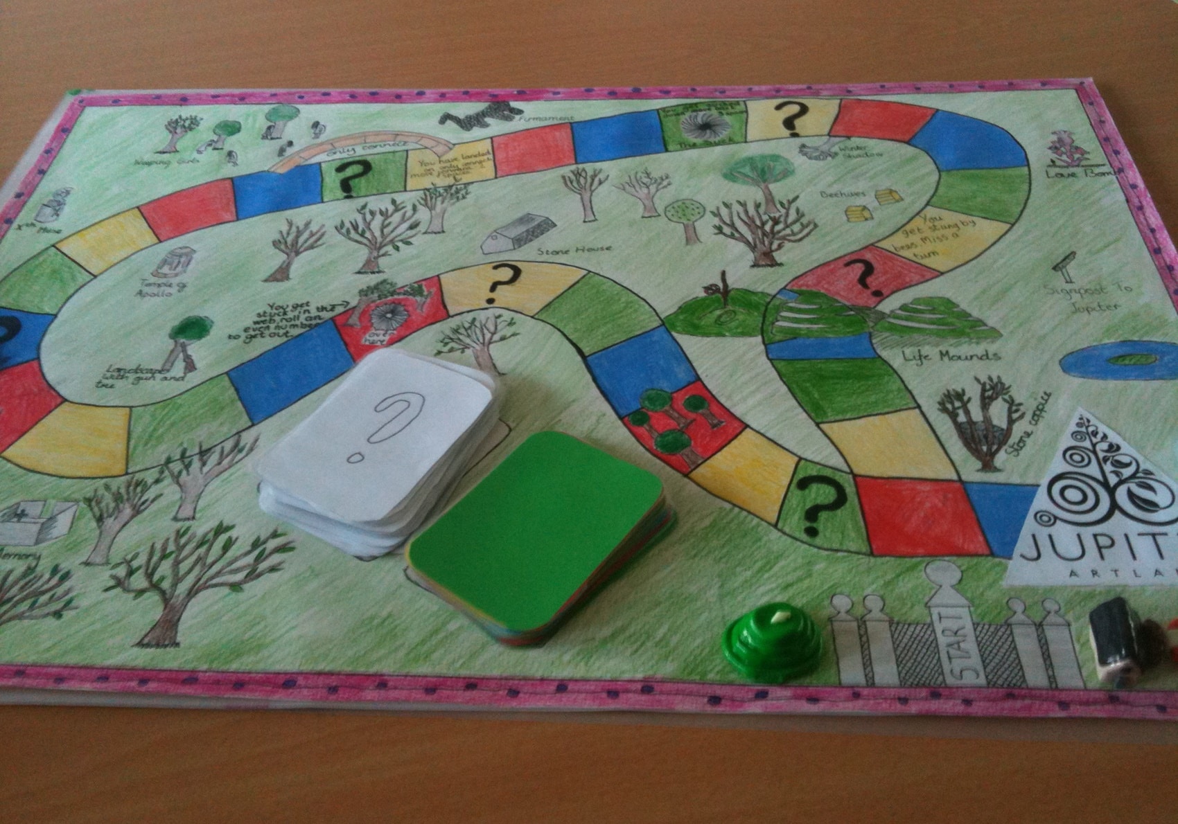 The last strand of the project was a school’s Enterprise Project to create a Jupiter Artland Board Game. Ten children from across the age range of the school formed a working group to develop this. Several “board meetings” took place at Jupiter Artland and at Juniper Green to develop the game. Sandy Duncan who founded the company Drumond Park Games which created Articulate amongst other world famous games attended one of these meetings. He gave the children some fantastic advise and the board game that was developed was successfully sold in the shop.